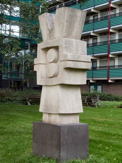 Rok In 1970, een jaar na “Buitelende Kinderen” werd aan de Zonnelaan een ander beeld van hem geplaatst: ook twee geometrisch vereenvoudigde kinderen. In eerste instantie zie je daar een figuur met enorme hoorns; het zou een beeld van een verdwenen cultuur uit Zuid-Amerika kunnen zijn. Al gauw zie je echter de twee kinderen: de een staat rechtop en houdt de ander, op zijn kop, boven zich vast. Wanneer je dat beeld ondersteboven zet wordt het wel degelijk heel anders: het staat dan stevig wijdbeens op de grond en is minder topzwaar. Het schijnt dat de kunstenaar het oorspronkelijk zo had bedoeld en dat dit een ingreep is van zijn vrouw. Ze maakte haar man erop attent dat dit logischer is, omdat het meisje een rok draagt. |